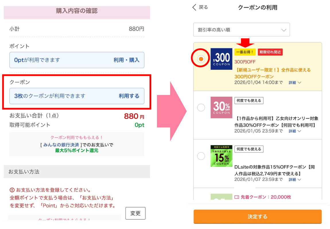 1. DLsiteに無料登録して【300円OFFクーポン】ゲット