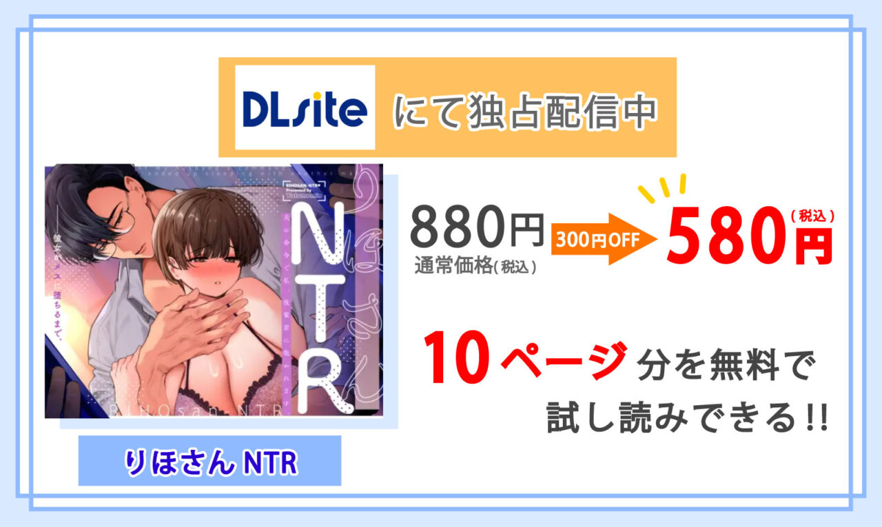 ちなみにマンガ『りほさんNTR~夫の命令で私、後輩君に抱かれます。~』DLsiteで、いまなら以下の価格で配信されています。