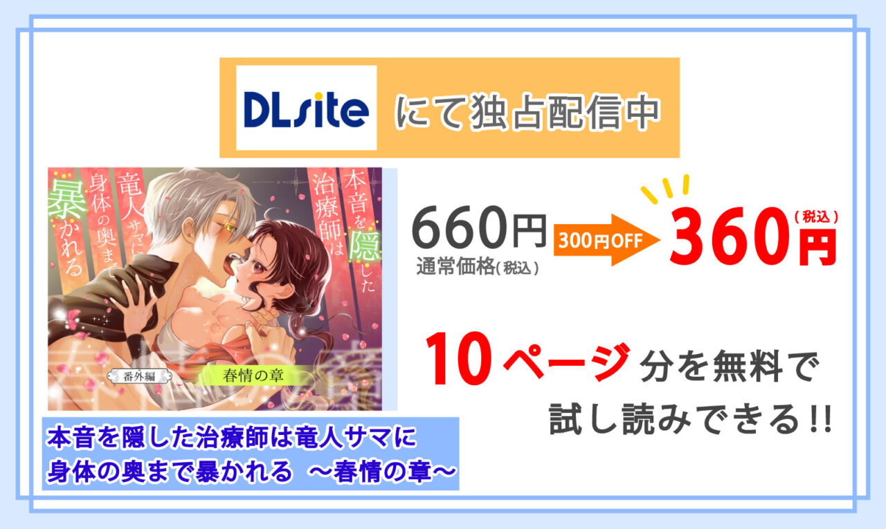 ちなみにマンガ『本音を隠した治療師は竜人サマに身体の奥まで暴かれる〜春情の章〜』はDLsiteで、いまなら期間限定(2026/03/06まで)で10%OFF!!以下の価格で購入することができます。