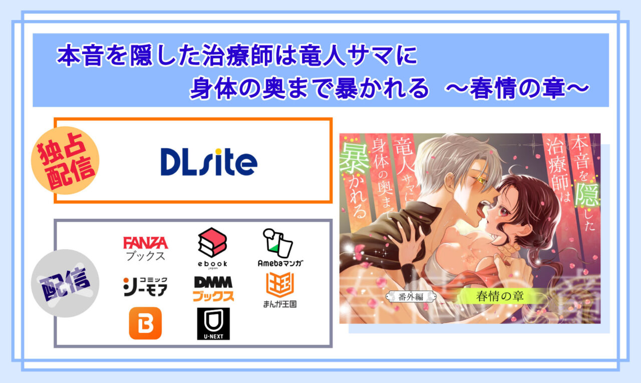 管理人結論から言いますと、マンガ『本音を隠した治療師は竜人サマに身体の奥まで暴かれる〜春情の章〜』はただいま、DLsiteでしか配信されていません。