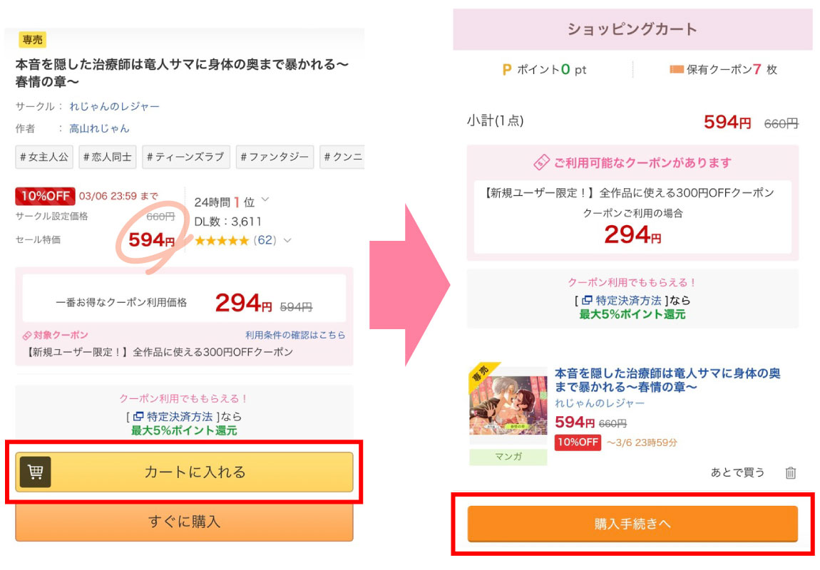 漫画『本音を隠した治療師は竜人サマに身体の奥まで暴かれる〜春情の章〜』のように期間限定割引セール中の作品は、割引後の価格に対して300円OFFすることが出来ますので、非常にお得になります。
