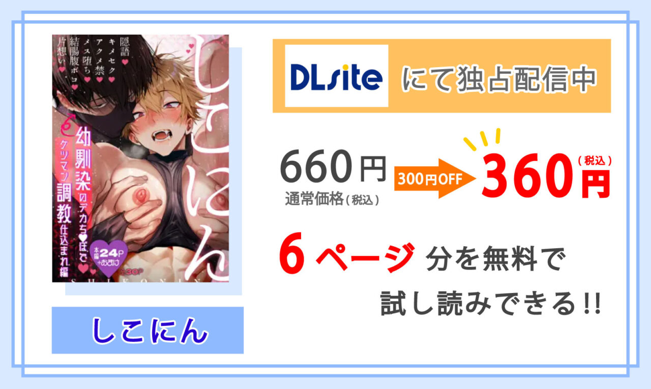ちなみにマンガ『しこにん〜幼馴染のデカちんぽでケツマン調教仕込まれ編〜』はDLsiteで、いまなら期間限定(2025/12/29まで)で50%OFF!!以下の価格で購入することができます。