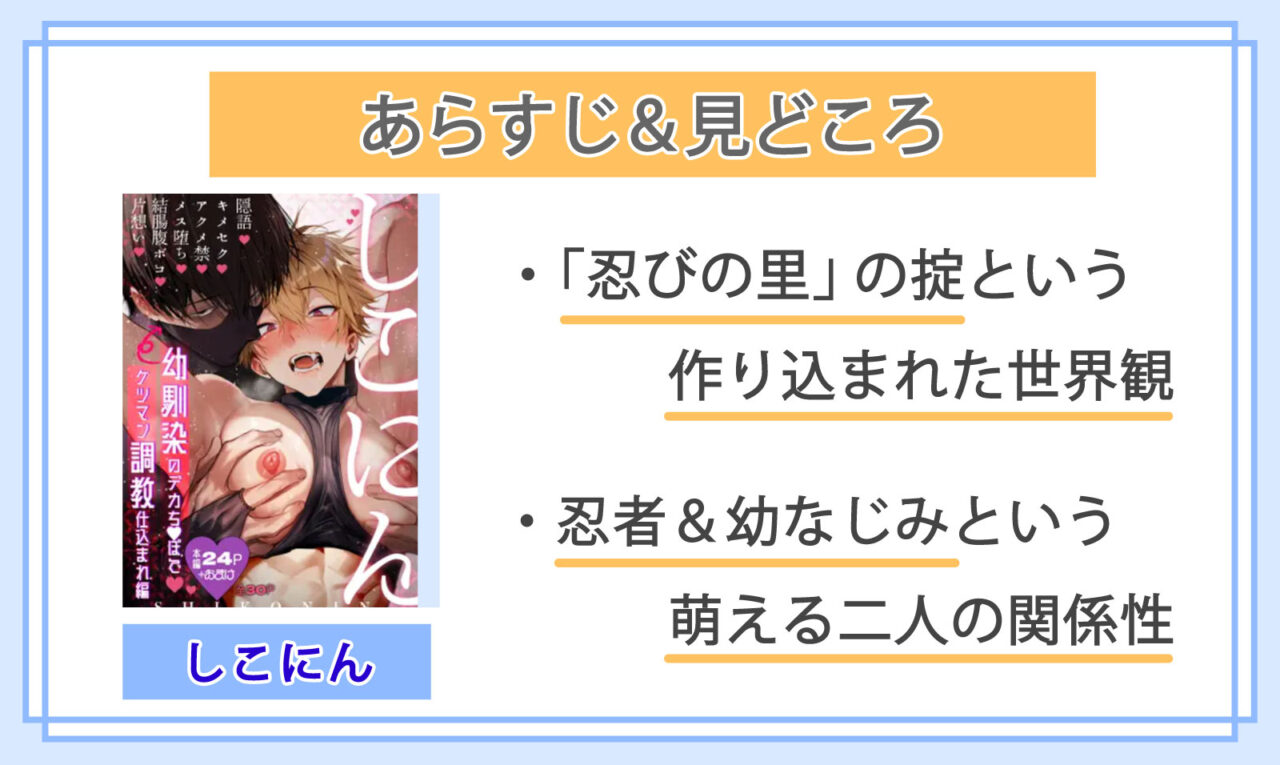 舞台は某所「忍びの里」。不出来な忍者が男色を命じられ、一緒に育ってきた幼馴染にハジメテを奪われる…。という設定だけでもすでに最高なのですが、本来なら輪姦されるところを恩情で幼馴染に開発する役目が回ってきたことや、里の掟として任務を拒否することはありえないという現状、藍は未明のことを本当に友達だと思っていたらしいことなど、いろんな状況がより尊みを増してくれます。本作は設定だけでも素晴らしく読者のツボを刺激してくれるのです。