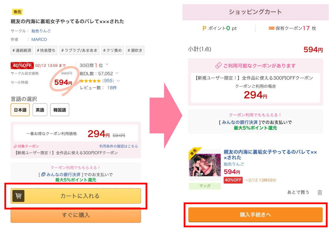 漫画『親友の内海に裏垢女子やってるのバレて×××された』のように期間限定割引セール中の作品は、割引後の価格に対して300円OFFすることが出来ますので、非常にお得になります。
