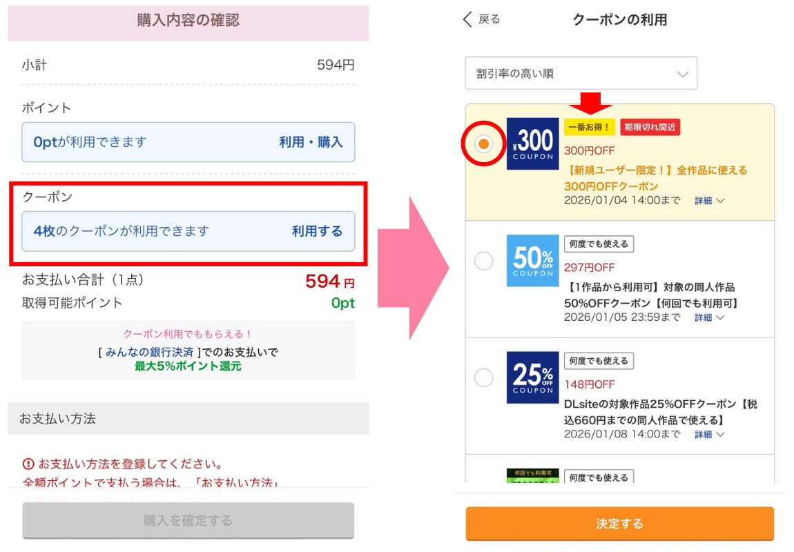 新規登録の時は【300円OFFクーポン】を利用するのが一番お得になりますので、それを選択します。