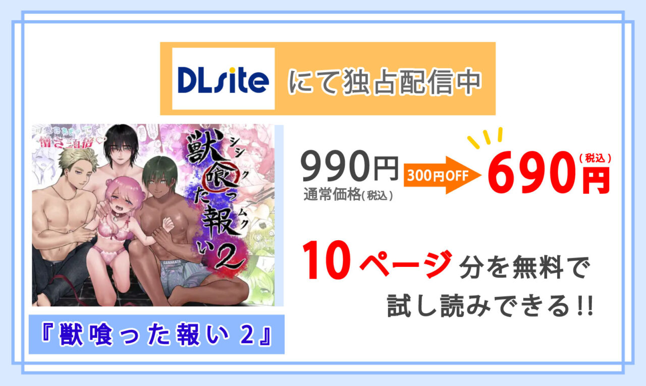 ちなみにマンガ『獣喰った報い2』DLsiteで、いまなら以下の価格で配信されています。