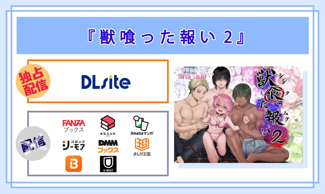 比較してみた結果、マンガ『獣喰った報い2』は、「国内最大級の二次元総合ダウンロードショップ」であるDLsiteでしか配信されていないことが分かりました♪
