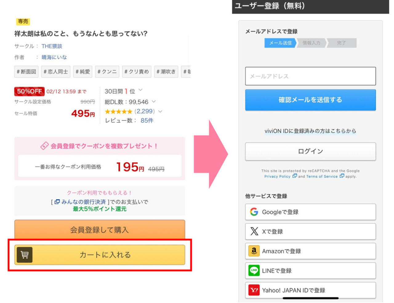 本ページのリンクボタンを押して漫画『祥太朗は私のこと、もうなんとも思ってない?』購入ページにアクセスし、DLsiteに無料登録します。