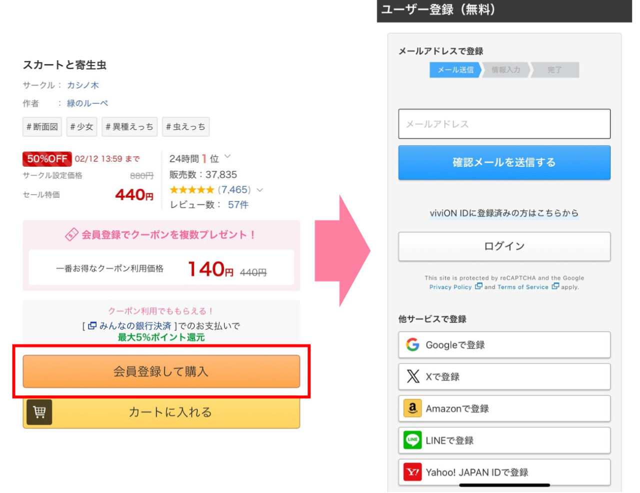 本ページのリンクボタンを押して漫画『スカートと寄生虫』購入ページにアクセスし、DLsiteに無料登録します。