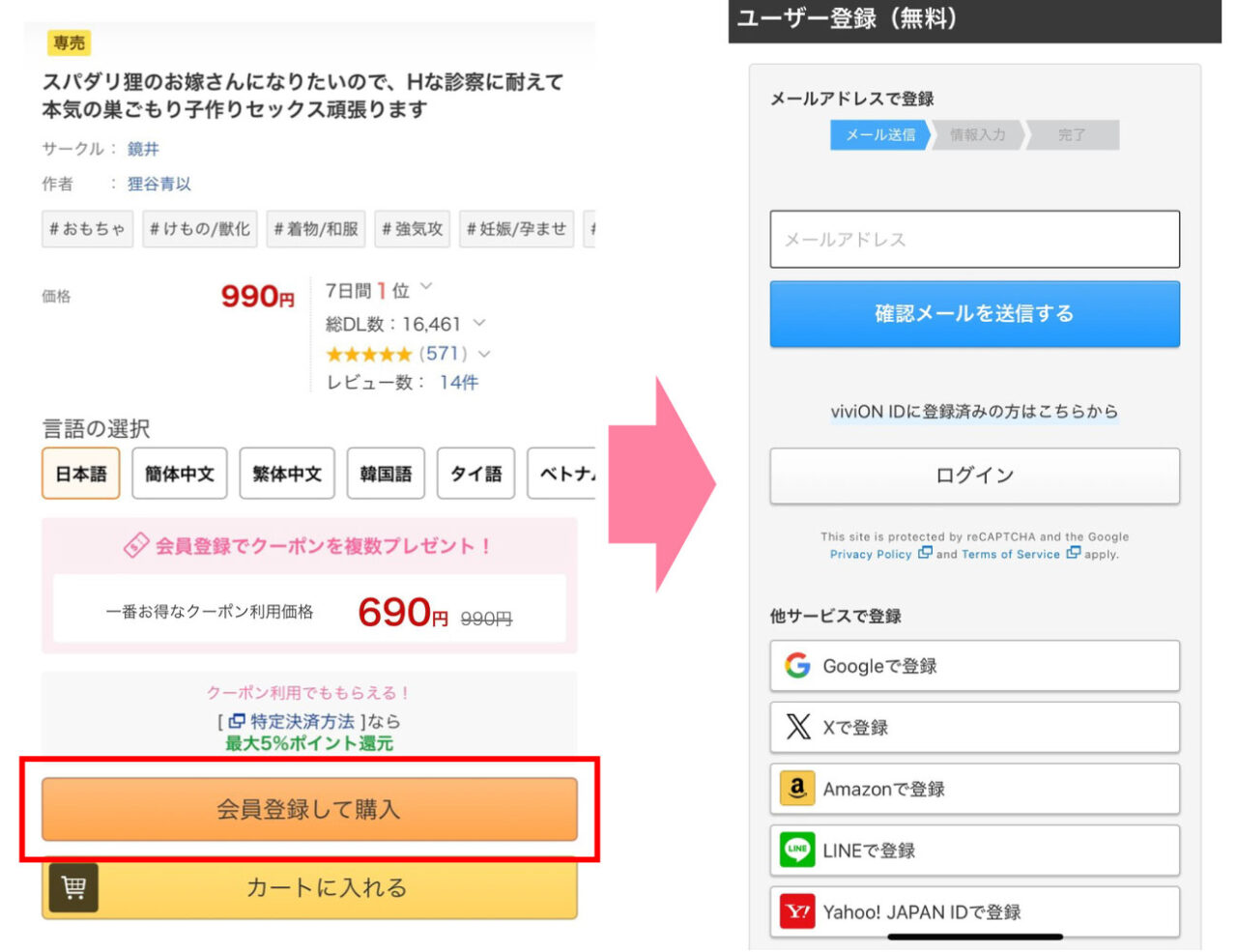 本ページのリンクボタンを押して漫画『スパダリ狸のお嫁さんになりたいので、Hな診察に耐えて本気の巣ごもり子作りセックス頑張ります』購入ページにアクセスし、DLsiteに無料登録します。