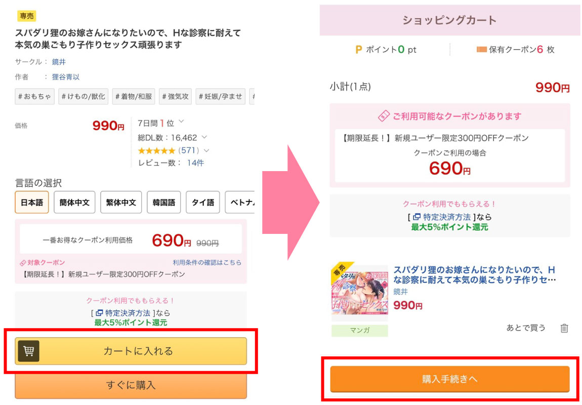 購入画面に移行すると、漫画『スパダリ狸のお嫁さんになりたいので、Hな診察に耐えて本気の巣ごもり子作りセックス頑張ります』の購入に対して利用できるクーポンが表示されます。その一覧の中から、一番お得になるクーポンを選びます。