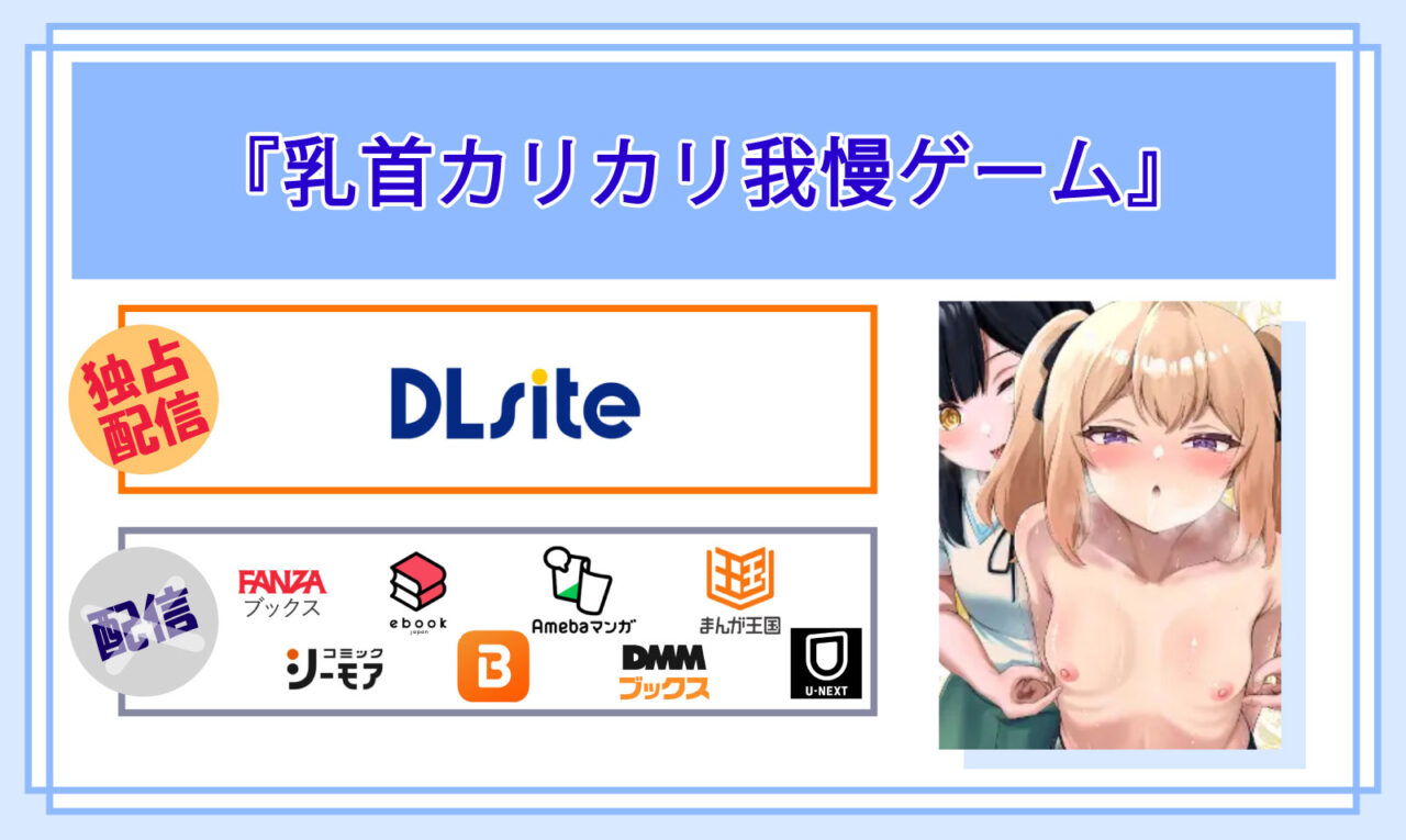 比較してみた結果、マンガ『乳首カリカリ我慢ゲーム』の電子書籍は、「国内最大級の二次元総合ダウンロードショップ」であるDLsiteでしか配信されていないことが分かりました♪
