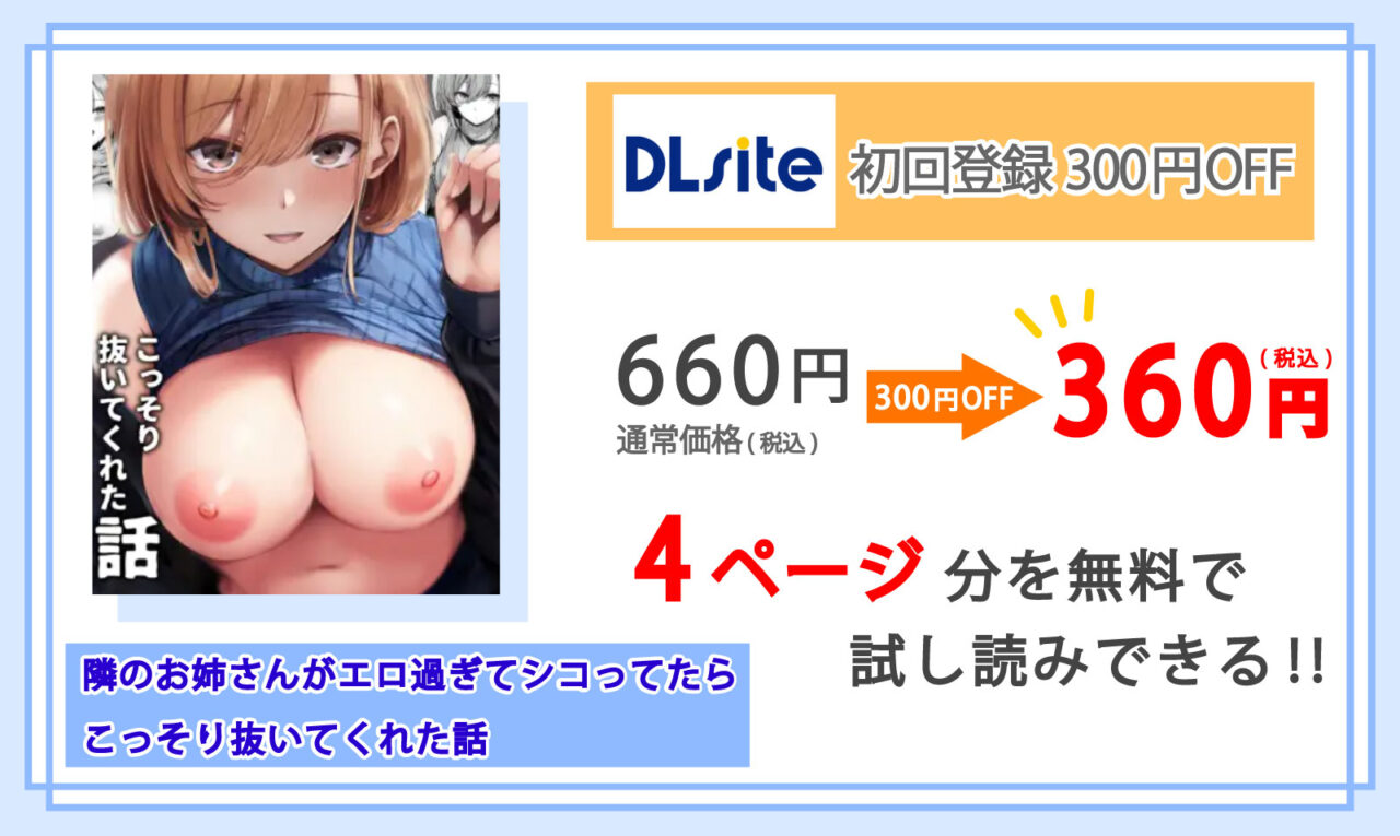 DLsiteでなら新規登録時にもらう”300円OFFクーポン”を使うことで、マンガ『隣のお姉さんがエロ過ぎてシコってたらこっそり抜いてくれた話』が非常にお得に購入できます!