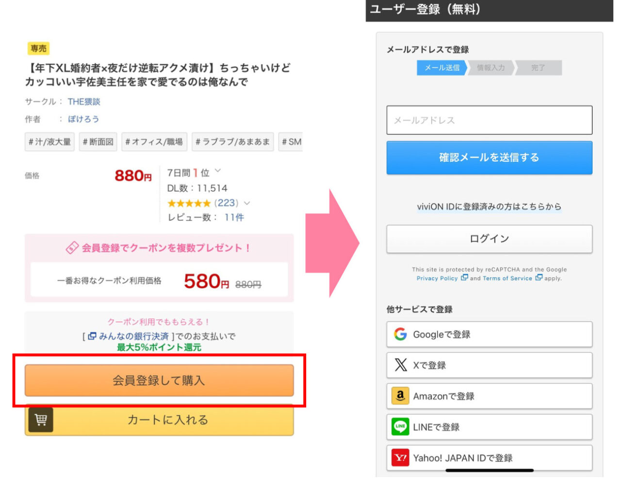 本ページのリンクボタンを押して漫画『【年下XL婚約者×夜だけ逆転アクメ漬け】ちっちゃいけどカッコいい宇佐美主任を家で愛でるのは俺なんで』購入ページにアクセスし、DLsiteに無料登録します。