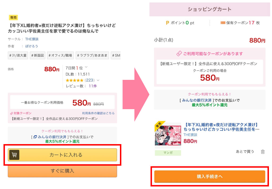 漫画「【年下XL婚約者×夜だけ逆転アクメ漬け】ちっちゃいけどカッコいい宇佐美主任を家で愛でるのは俺なんで」をDLsiteでお得に購入する方法