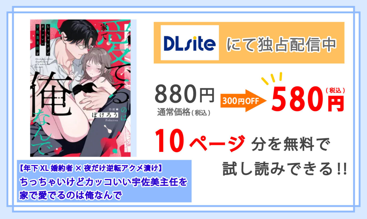 ちなみにマンガ『【年下XL婚約者×夜だけ逆転アクメ漬け】ちっちゃいけどカッコいい宇佐美主任を家で愛でるのは俺なんで』はDLsiteで、いまなら期間限定(2026/01/01まで)で10%OFF!!以下の価格で購入することができます。