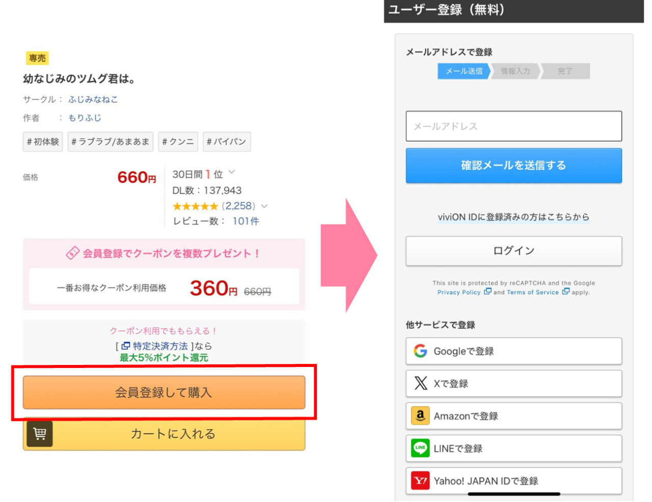 本ページのリンクボタンを押して漫画『幼なじみのツムグ君は。』購入ページにアクセスし、DLsite無料登録します。