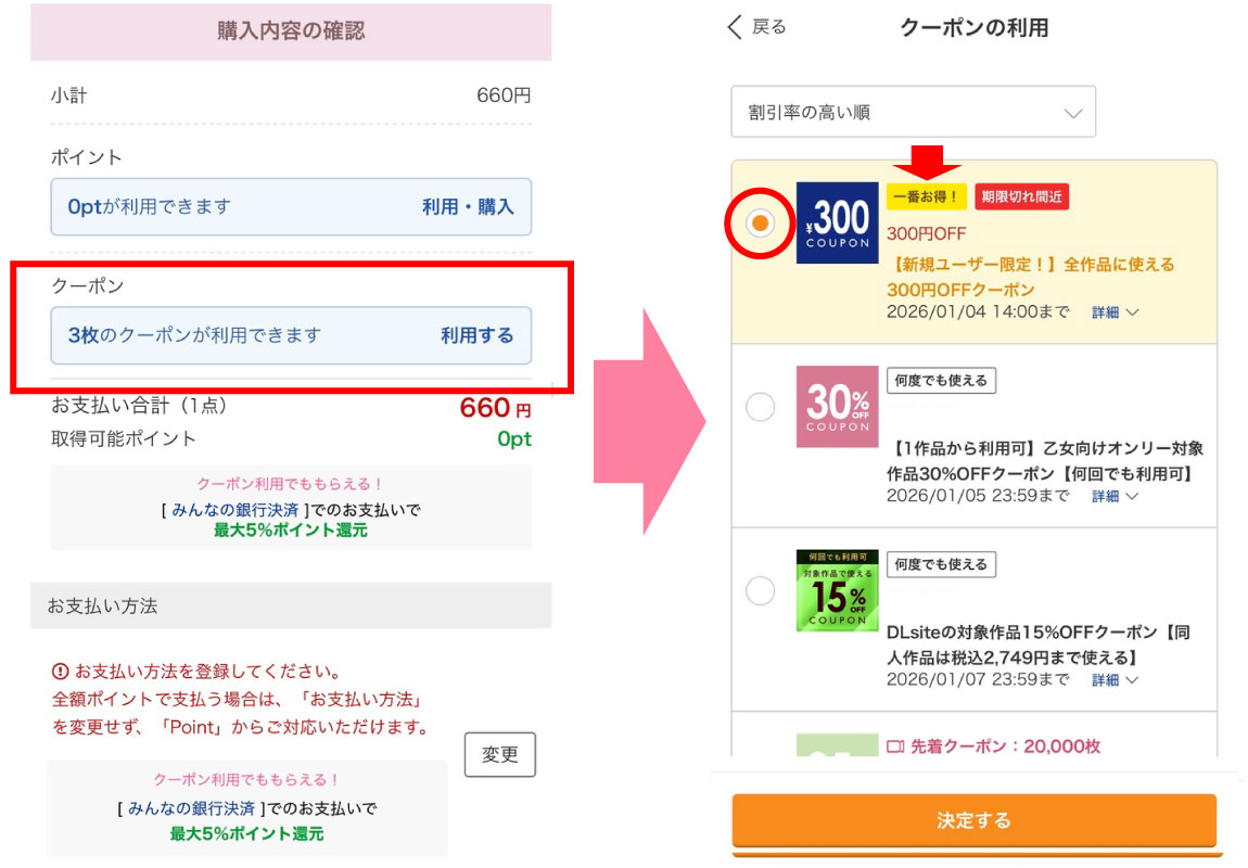 新規登録の時は【300円OFFクーポン】を利用するのが一番お得になりますので、それを選択します。