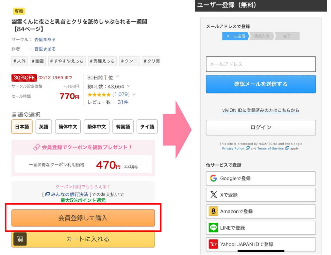 本ページのリンクボタンを押して漫画『幽霊くんに夜ごと乳首とクリを舐めしゃぶられる一週間』購入ページにアクセスし、DLsite無料登録します。