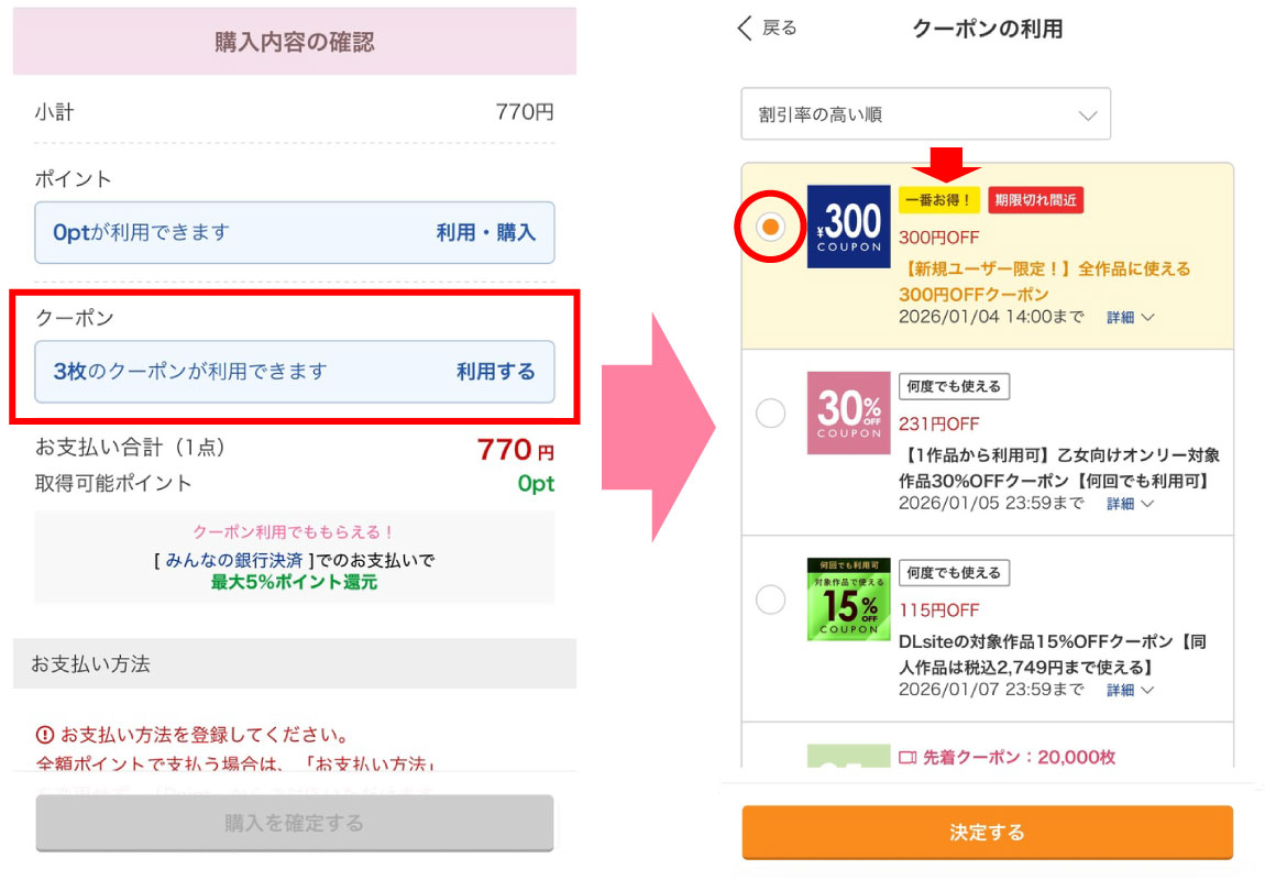 1. DLsiteに無料登録して【300円OFFクーポン】ゲット