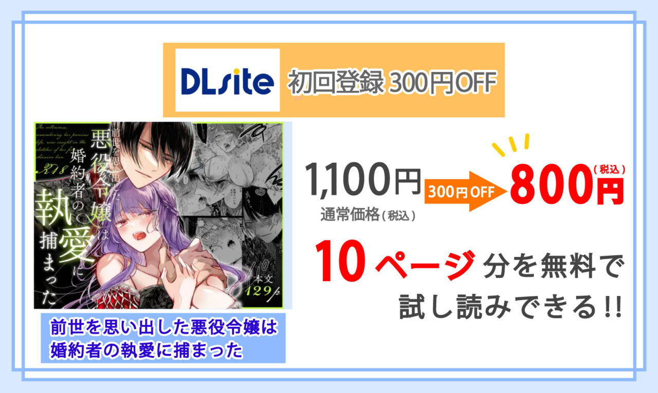 DLsiteでなら新規登録時にもらう300円OFFクーポン”を使うことで、マンガ『前世を思い出した悪役令嬢は婚約者の執愛に捕まった』が非常にお得に購入できます!
